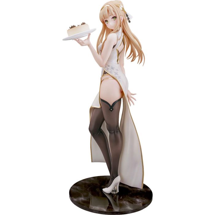 The figure features Klaudia in a white Chinese dress outfit, beautifully styled with a special hairstyle! Visual highlights include her gentle smile, her slender leg peeking out from the high slit of her dress, as well as the Uni inside her bamboo steamer.