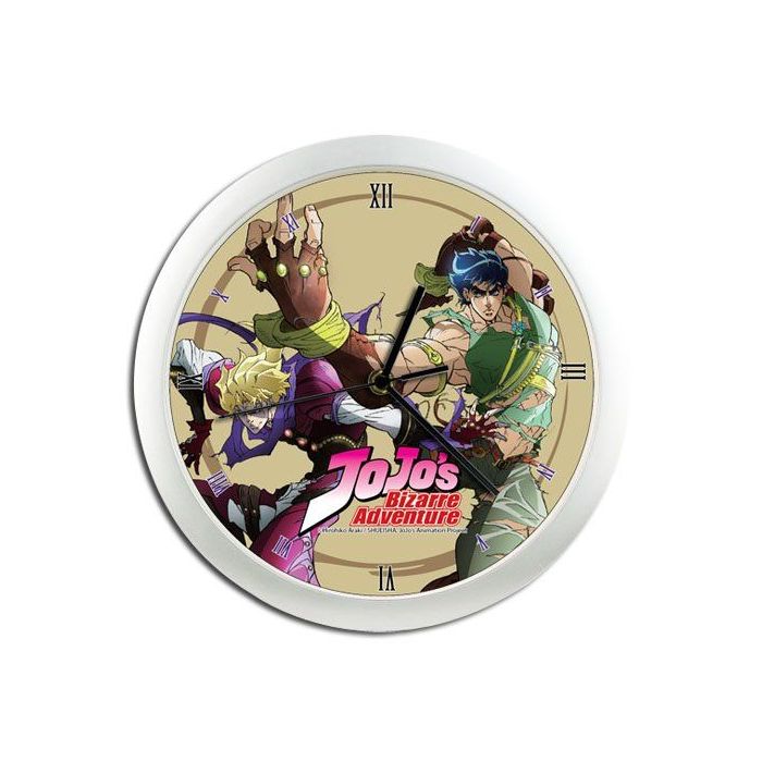 Official JoJo's Bizarre Adventure anime wall clock. Requires 1 AA battery (not included). Size: clock dial (image) only 8.7" (22 cm) diameter. Clock size approximately 9.75" (25 cm) in diameter.