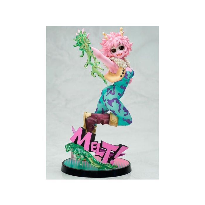Mina jumps into action dessed in her hero suit, showing off her special acid Quirk! Her pose and expression show off her fun and energetic personality perfectly, and her Quirk has been recreated with clear parts to make it even more unique amongst the bright colors of Mina's design.
