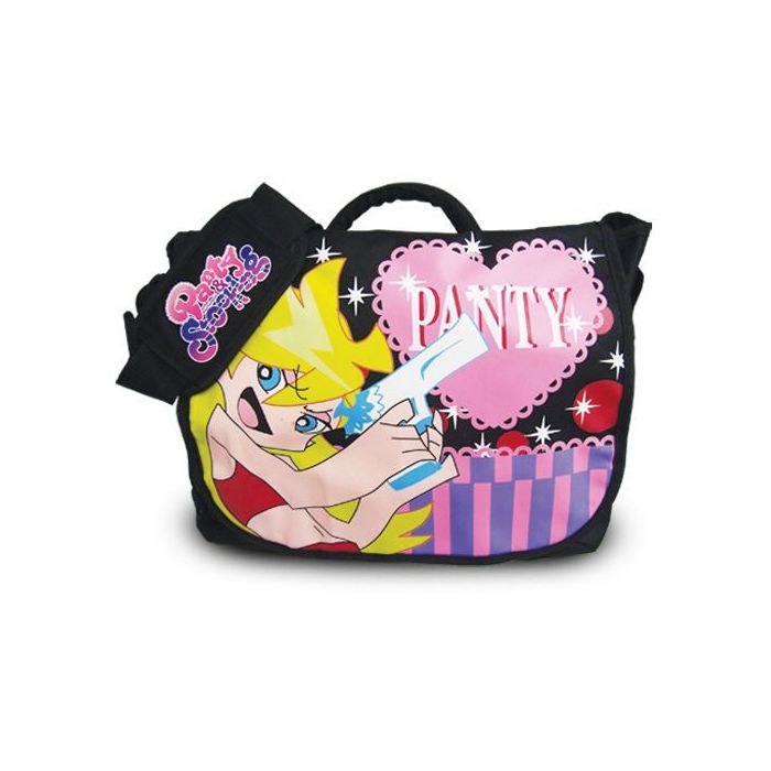 This messenger bag of Panty is 40cm wide and 33cm tall. Officially licensed and very good quality. Flip over the front panel, you will find two button closure pockets. There's one large interior compartment. On the right side of the messenger, there are five small pocket holders for pen or pencils.
